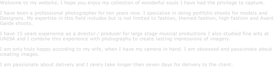 I was the director / producer for numerous stage productions and have 15 years experience in this field. I also studied Fine Arts and I use both these experiences in painting with my camera. I am passionate about my work and I am only really at peace with myself when I have a camera in hand.